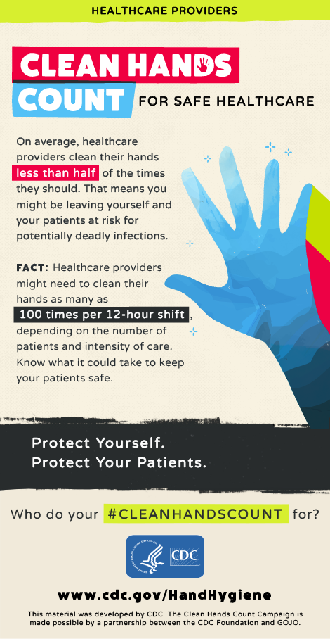 Clean Hands Count campaign offers posters, factsheets, and brochures for healthcare providers and patients. Be sure to tell CDC who your clean hands count for using hashtag #CleanHandsCount on Twitter, Facebook, Instagram, and Pinterest.