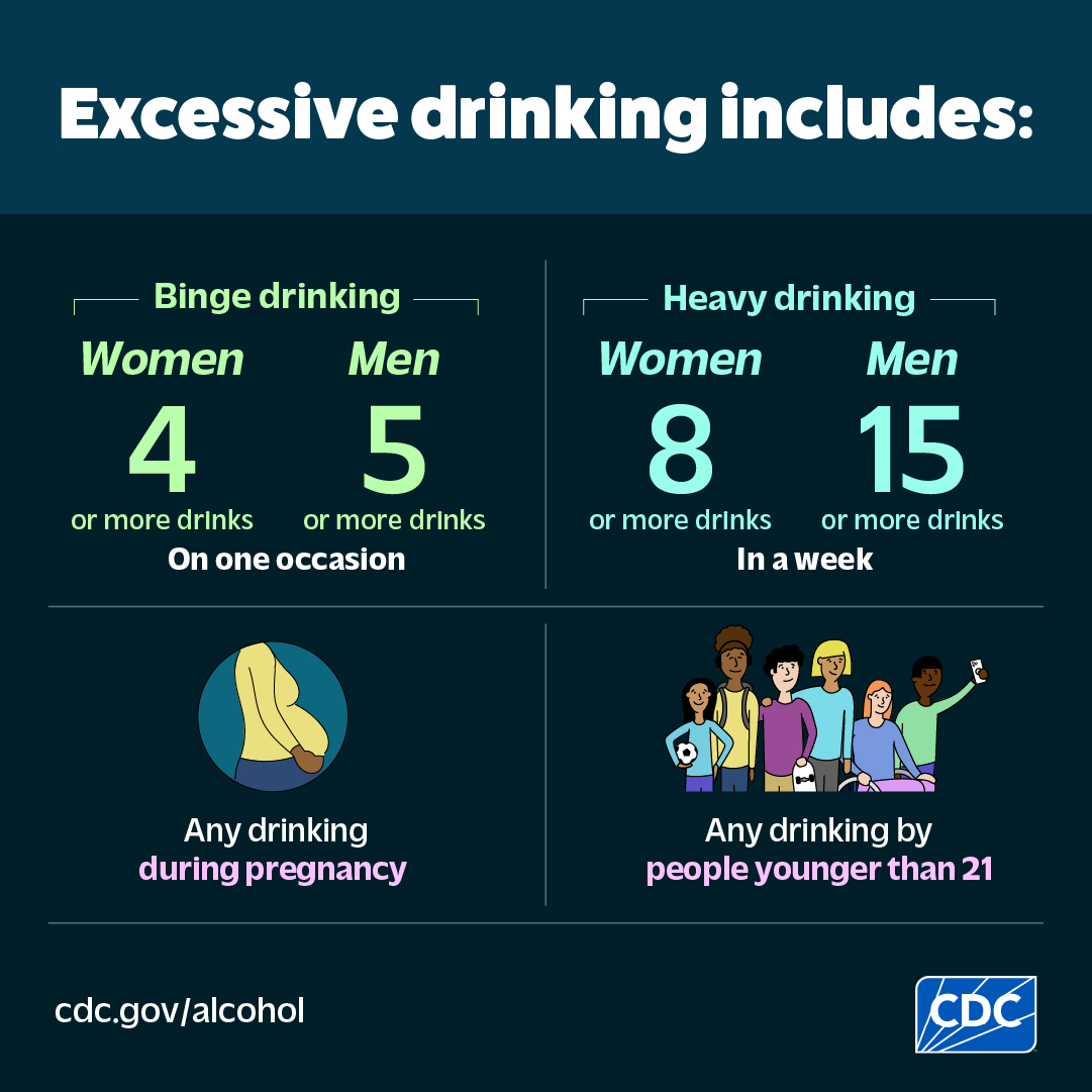 - Excessive drinking includes binge drinking, heavy drinking, and any drinking during pregnancy or by people younger than 21.
