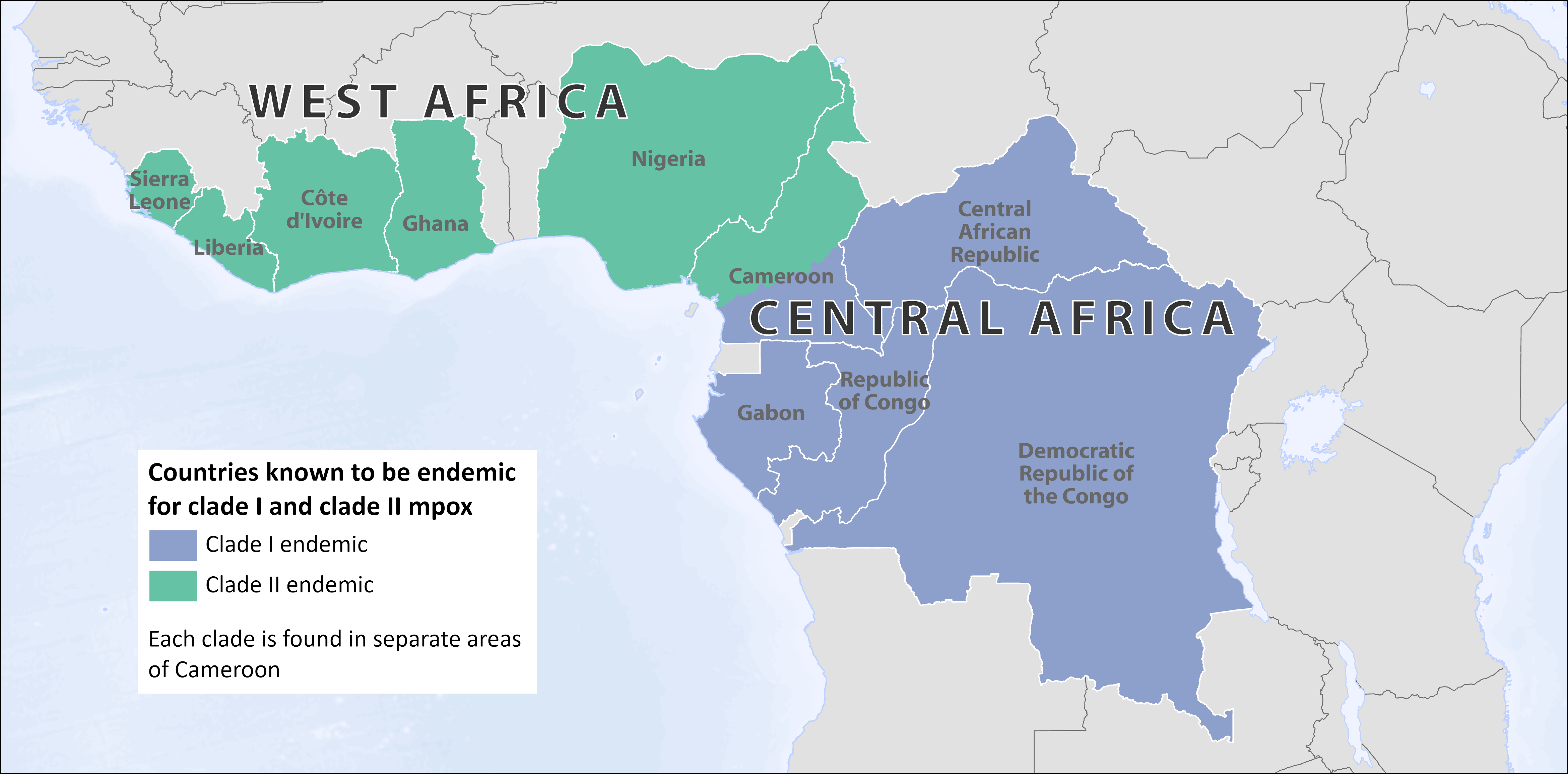 | Geography | Endemic to Central Africa, including Republic of the Congo, Gabon, Democratic Republic of the Congo (DRC), Central African Republic, and southeastern Cameroon | Newly identified in the DRC with spread to nearby countries; travel-associated cases around the world | Endemic to West Africa, including northwestern Cameroon, Nigeria, Ghana, Cote d'Ivoire, Liberia, and Sierra Leone. | Endemic to West Africa (identified originally in Nigeria); spread to more than 100 non-endemic countries as part of the ongoing global outbreak that began in 2022 |
