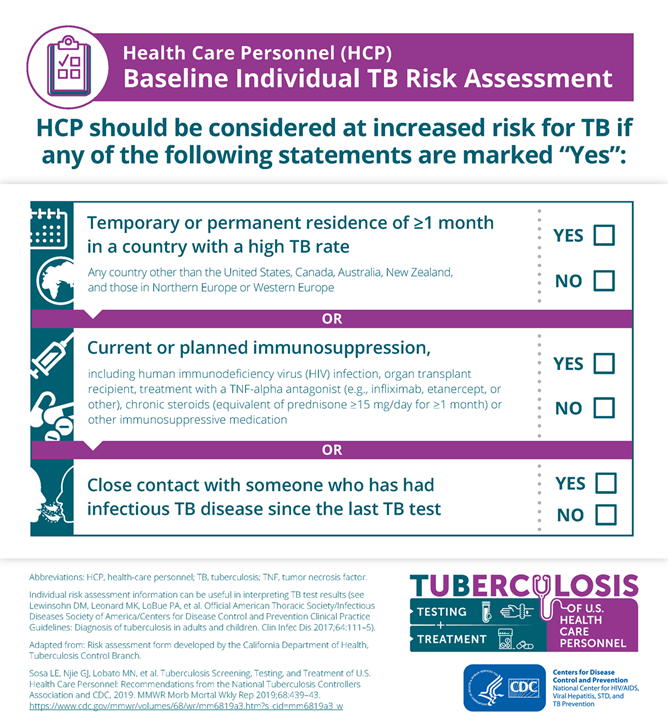 All U.S. health care personnel should have baseline tuberculosis (TB) screening, including an individual risk assessment. Health care personnel are considered at increased risk for TB if any of the statements on the risk assessment are marked "Yes." Use this assessment to help interpret TB test results.